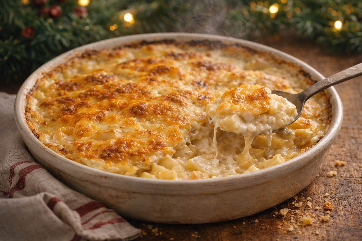 Pour un gratin digne des Fêtes, la structure est essentielle. Coupe les patates finement et régulièrement afin qu’elles cuisent au même rythme. Monte le gratin bien serré pour limiter l’évaporation. Couvre le plat au début pour une cuisson douce à la vapeur, puis découvre à la fin pour obtenir une surface dorée. Cette méthode professionnelle garantit un gratin fondant, crémeux et stable, même après réchauffage — un atout majeur quand on cuisine pour une grande tablée.