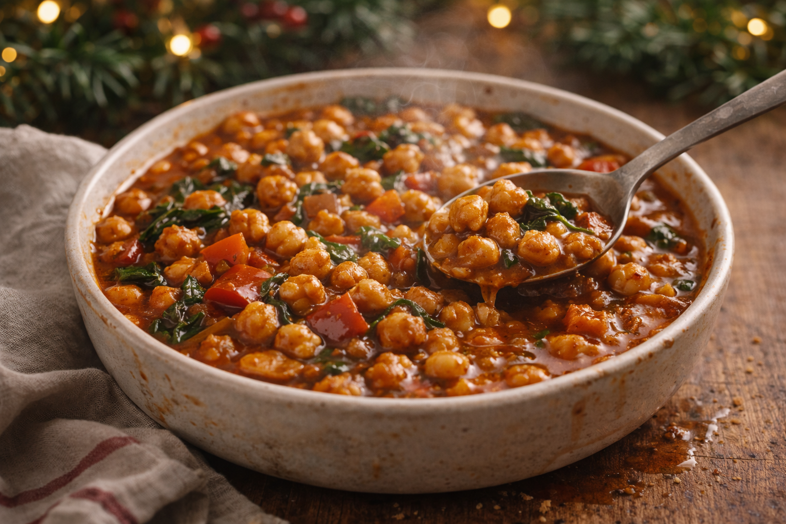La clé d’un plat végétarien festif est la texture. Rôtir les pois chiches avant de les intégrer à la sauce est une technique professionnelle essentielle. Cette étape développe des arômes de noisette, raffermit la légumineuse et évite l’effet pâteux. Une fois mijotés dans la sauce, ils offrent un contraste crousti-fondant très satisfaisant. Pour les Fêtes, ce procédé transforme un ingrédient économique en véritable plat central, riche, nourrissant et mémorable pour tous les convives.