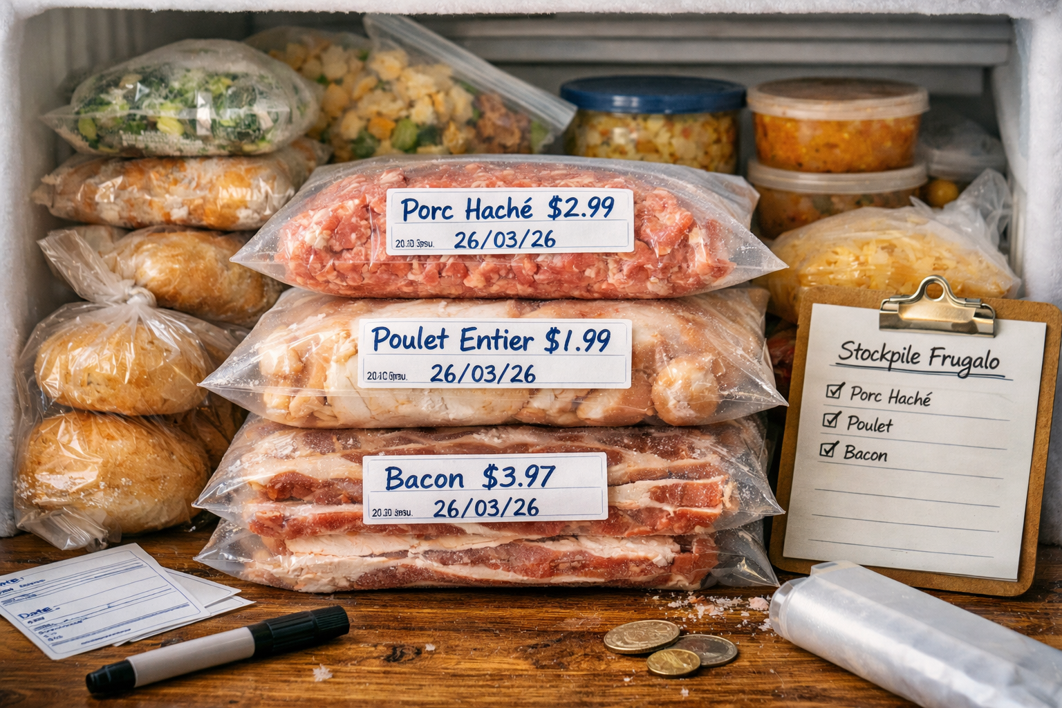 Dans une semaine comme celle du 26 mars au 1er avril 2026, la plus grande erreur serait d’acheter seulement pour les trois prochains jours. Les vraies économies se font quand tu achètes certains produits au bon moment pour les utiliser plus tard, sans te laisser imposer les hausses de la semaine suivante. C’est exactement là que la congélation stratégique devient une arme FRUGALO redoutable. Le porc haché à 2,99 $, le poulet entier à 1,99 $, les hauts de cuisses près du plancher, le bacon à bon prix et même certains pains se congèlent parfaitement. Le secret, ce n’est pas juste de congeler : c’est de portionner avant. Tu sépares en formats repas, tu identifies la date, puis tu transformes un spécial temporaire en prix prolongé chez toi. Quand les prix sont instables, ton congélateur et ton garde-manger deviennent une barrière contre l’inflation. Acheter au prix plancher, puis consommer plus tard, c’est une façon simple, légale, concrète et ultra puissante de ne plus subir les circulaires à la semaine.