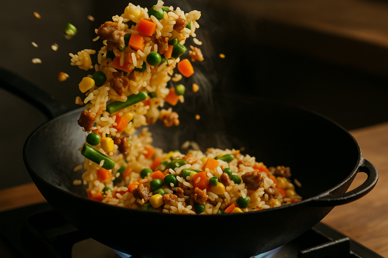C’est la recette de sauvetage par excellence : celle qui transforme trois restants et un sac de légumes surgelés en souper complet digne d’un resto asiatique. Pas besoin de wok en titane ni de riz jasmin à 15 $ le sac — juste un peu de porc haché, du riz Rooster, des légumes Sans Nom et une cuillère de sauce soya.Le secret ? Le riz froid de la veille. Il devient légèrement croustillant, absorbe les saveurs et te donne cette texture “take-out” sans la facture Uber Eats. Et pour moins de 1,80 $ la portion, c’est un repas rapide, nourrissant et zéro gaspillage. Cette recette économique de riz frit maison est parfaite pour vider ton frigo intelligemment : elle s’adapte à tout — poulet, tofu, crevettes, œufs ou restants de légumes. En 20 minutes, t’as un plat complet, coloré, plein de protéines et bon pour ton budget (et ta fierté).