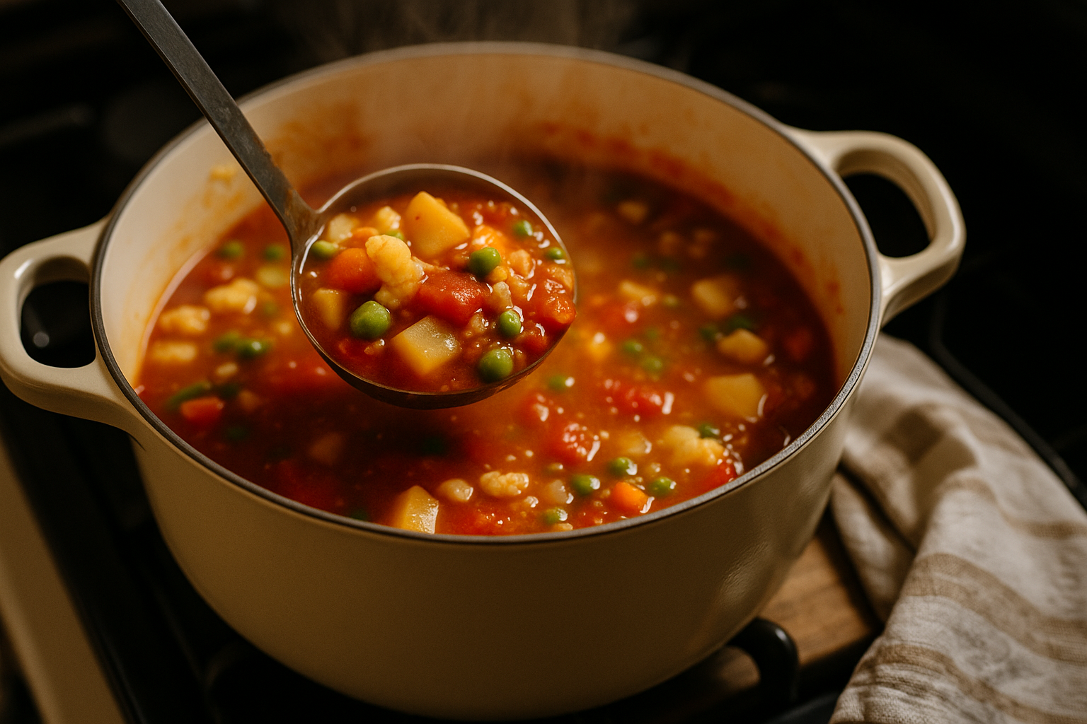 Elle ne demande ni talents culinaires ni portefeuille épais : juste un sac de légumes surgelés Sans Nom, une boîte de tomates broyées, un oignon et un peu de gros bon sens Frugalo. Résultat ? Une recette d’hiver 100 % québécoise, nourrissante, réconfortante et à 1,10 $ la portion. C’est un vrai repas complet — pas une simple entrée — prêt en 30 minutes, parfait pour les soirs de semaine, les lunchs du bureau ou les journées “je reste en mou”.Cette soupe maison à petit prix prouve que manger santé, c’est pas une affaire de luxe :  les légumes surgelés sont économiques, riches en nutriments et parfaits pour éviter le gaspillage. Et en ajoutant un peu de riz, d’orge ou de lentilles, tu transformes cette soupe simple en repas complet et soutenant.