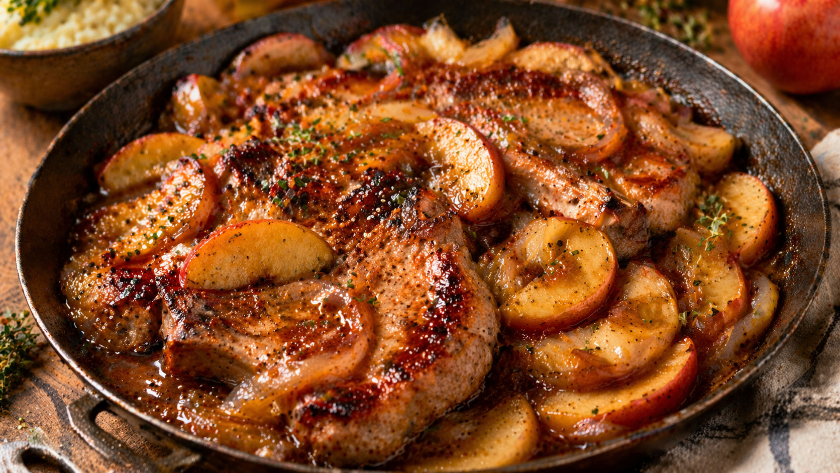 Les côtelettes de porc bon marché se font souvent maltraiter. On les cuit trop, on les assèche, puis on conclut que le porc n’est “pas tant bon”. Le problème n’est pas le porc. Le problème, c’est la brutalité. Cette recette-là fait l’inverse. On saisit, on baisse le feu, on laisse les pommes et les oignons créer un petit jus doux, puis on donne aux côtelettes une cuisson beaucoup plus calme. Résultat : un repas tendre, brillant, très rassurant, avec juste assez de douceur pour rappeler les grands classiques québécois, sans tomber dans le vieux souper triste. À 2,49 $ chez IGA, ces côtelettes méritent franchement mieux qu’une cuisson punitive.