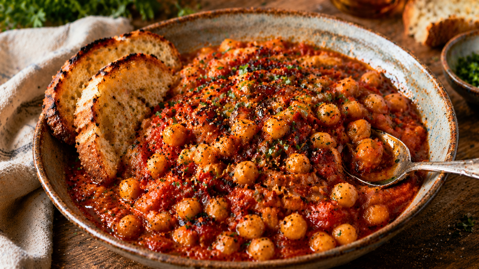 Le pois chiche devient beaucoup plus intéressant quand tu travailles sa texture. Ne le noie pas dans la sauce sans fin. Laisse-le braiser, réduis un peu, puis écrase-en une petite partie. Là, soudainement, tu n’as plus un simple plat de légumineuses : tu as quelque chose de riche, dense, actuel, puis franchement beaucoup plus satisfaisant.