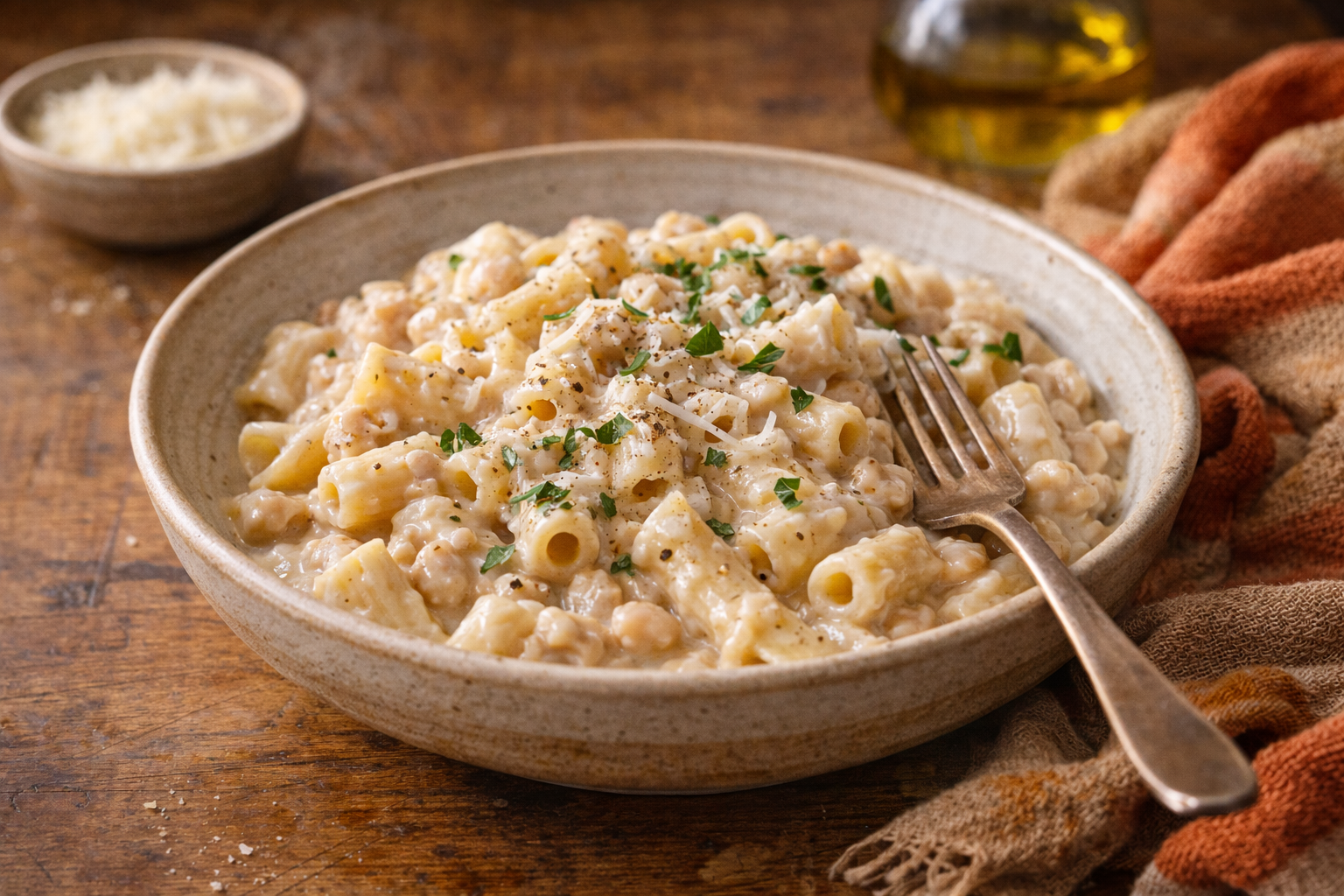Utilise l’aquafaba des haricots (le liquide de la conserve) comme base de sauce. Naturellement épaississante et riche en protéines végétales, elle crée une texture lisse et soyeuse sans crème. Le résultat rappelle un Alfredo des Pouilles, mais version frugale, légère et intelligente.