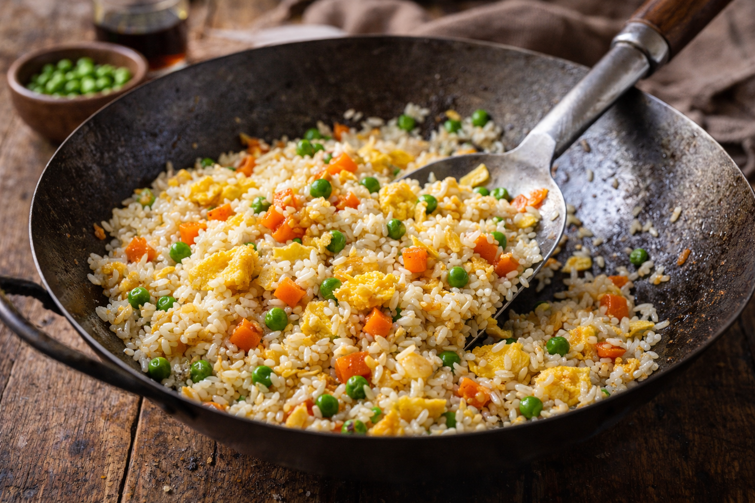 Utilise toujours du riz cuit la veille, bien refroidi. Les grains se raffermissent, se séparent mieux à la cuisson et absorbent la sauce sans devenir collants. C’est le secret du vrai riz frit de rue : une texture légère, sautée, jamais pâteuse — sans ajouter d’huile ni de technique compliquée.