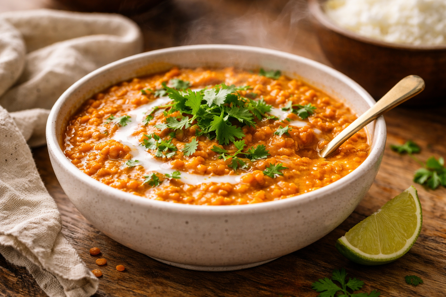Les lentilles corail sont idéales pour une cuisine frugale efficace : elles cuisent rapidement, fondent naturellement en une texture crémeuse et captent chaque épice comme une promesse de saveur. Résultat ? Un plat profond, nourrissant et enveloppant, qui goûte le luxe tout en respectant ton budget.