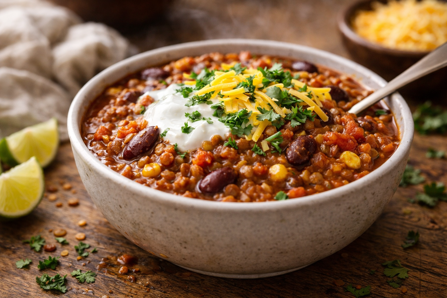 Les lentilles prennent ici la place du bœuf haché avec brio : même texture, même satisfaction, mais à une fraction du prix. Bien épicé, riche et généreux, ce chili coche toutes les cases : protéines, fibres, goût et économie. Avec les bons toppings, même les plus sceptiques oublient qu’il n’y a pas de viande. C’est le genre de recette qui prouve que bien manger à petit prix, c’est une question de stratégie, pas de sacrifice.