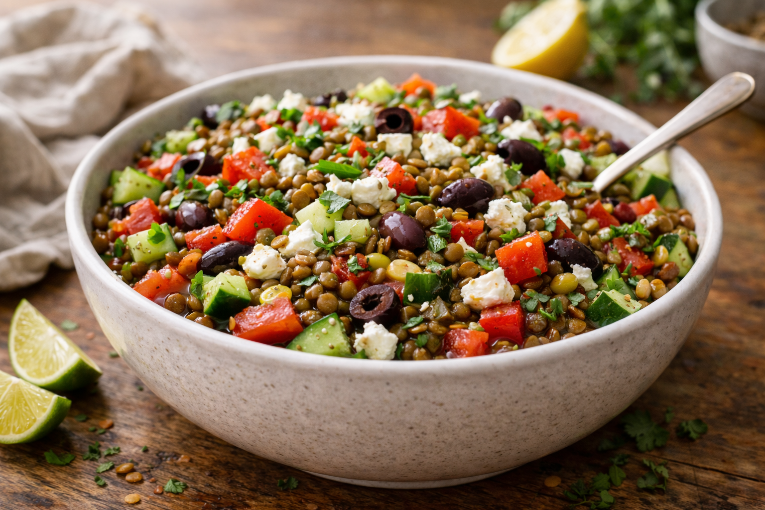 Les lentilles vertes sont idéales ici : elles restent fermes, tiennent bien la vinaigrette et donnent une vraie texture al dente. Combinées à des légumes croquants, un peu de feta et une touche de citron, elles transforment une simple salade en repas intelligent. C’est le genre de plat FRUGALO qui fait dire : « j’ai bien mangé… pis j’ai économisé ».