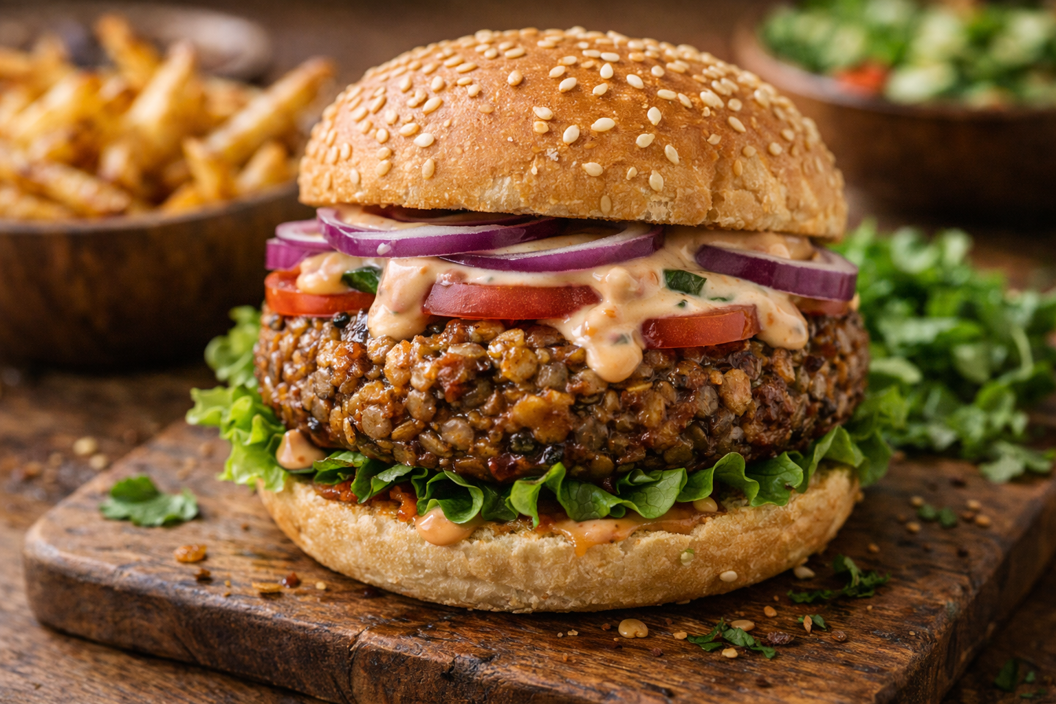 Les lentilles apportent la texture, les protéines et la tenue, sans le prix ni la lourdeur du bœuf. Que tu le serves dans un pain classique, en version végé deluxe ou simplement en galette avec une salade, ce burger prouve qu’on peut se faire plaisir sans se ruiner. Bonus non négligeable : ton portefeuille et la planète respirent en même temps.