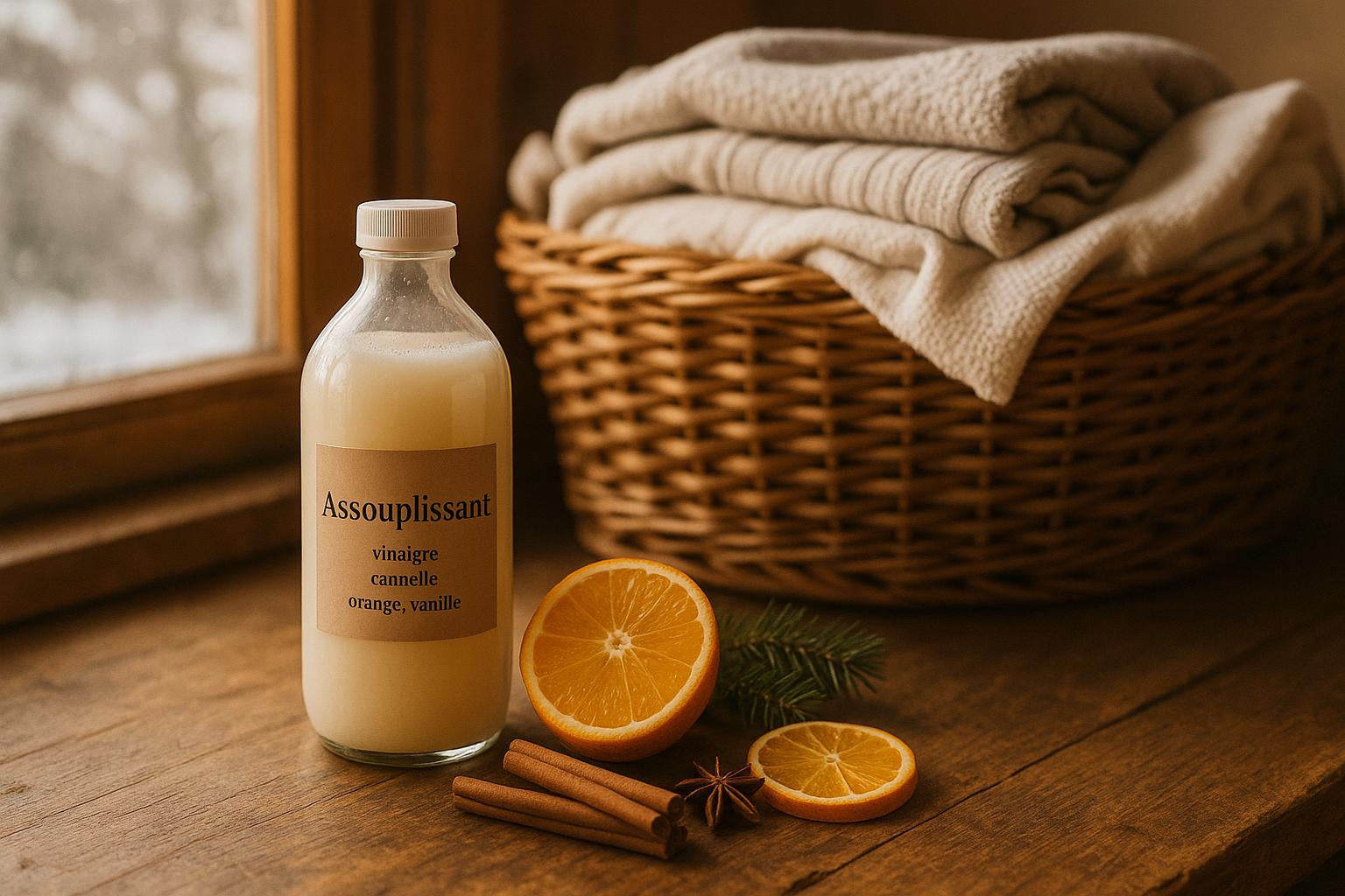 Faire le lavage, c’est plate. L’odeur fade de détergent industriel, le bruit de la laveuse, le froid dans la salle de lavage… bref, rien de magique. Mais ça, c’était avant. Parce que quand ton linge ressort en sentant le gâteau des Fêtes, la vanille, la cannelle et une petite touche d’orange douce, soudain, faire le lavage devient un vrai plaisir. Cet assouplisseur maison naturel transforme ta lessive en expérience sensorielle digne d’un spa hivernal. Il adoucit les tissus, élimine les résidus, neutralise les odeurs et parfume délicatement ton linge comme une brassée sortie d’un chalet québécois. Écologique, économique et sans produits toxiques, c’est l’alternative parfaite aux assouplisseurs commerciaux trop forts et trop chimiques. Résultat : des draps qui sentent la chaleur, des serviettes qui inspirent le confort et un panier à linge qui respire la propreté et le bonheur. C’est ça, le lavage version Frugalo — écolo, économique et qui sent le vrai Noël.