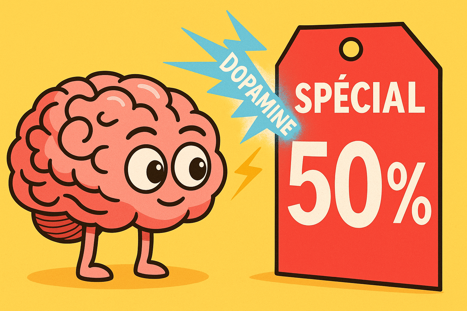 Quand tu vois un rabais « SPÉCIAL – 50 % », ton cœur fait un petit saut. Tu te sens comme si t’étais sur le bord de faire une bonne affaire. Mais ce que tu ressens, c’est pas de la sagesse — c’est de la dopamine, la molécule du plaisir anticipé. Ton cerveau te donne une tape dans le dos juste avant d’acheter, pas après.Et le punch ? Ce buzz chimique dure trois minutes. Après ça, t’as juste un nouveau t-shirt, un reçu pis un p’tit vide existentiel en prime. Exemple Frugalo : Tu vois une vente éclair « jusqu’à minuit ». Tu paniques, tu commandes. Deux jours plus tard, t’as oublié ce que t’as acheté. Quand le colis arrive, t’as plus d’excitation… juste du carton à plier.