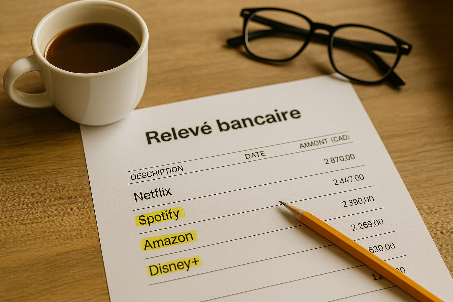 Netflix, Spotify, Amazon Prime, Apple Music, Disney+, livraison de café, app de méditation… chacun coûte juste « quelques dollars par mois ». Le problème, c’est qu’ensemble, ça fait une belle hémorragie mensuelle. Le marketing compte sur ta paresse cognitive. Quand c’est automatisé, t’y penses plus. Pis tant que ça sort pas en gros chiffres, ton cerveau s’en fout. Exemple Frugalo : T’as six abonnements de streaming, mais tu regardes juste les reprises de Dans une galaxie près de chez vous.🧰 Boîte à outils Frugalo
