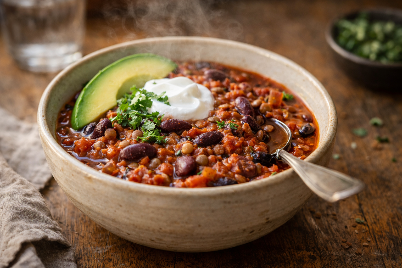 L’huile de coco est ton arme secrète : elle apporte une rondeur et une richesse qui remplacent la viande sans coûter plus cher. Double la recette quand les conserves sont en spécial et congèle en portions individuelles. Ce chili est encore meilleur réchauffé, parfait pour les lunchs économiques et les soupers sans réflexion.