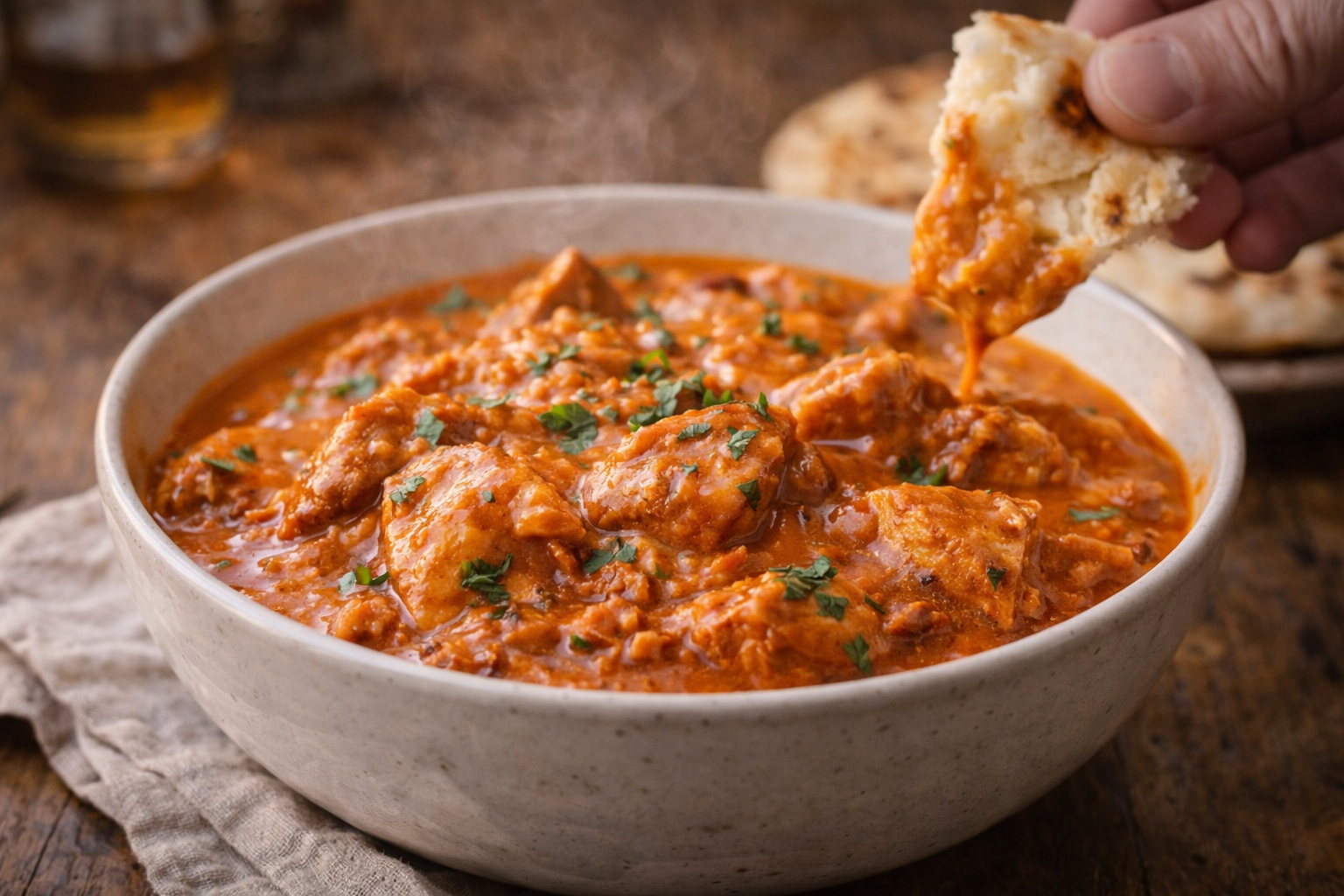 - Sers bien chaud, accompagné de riz basmati ou de pain naan, avec un peu de coriandre fraîche si désiré.