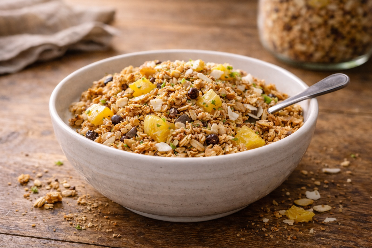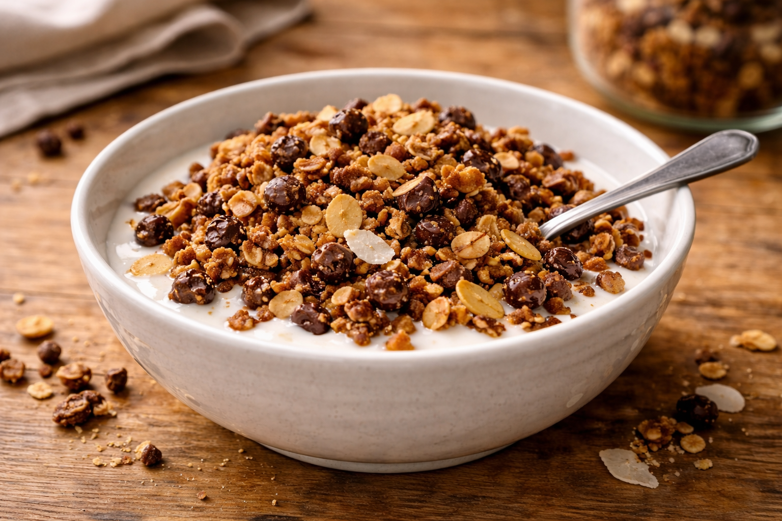 Ce granola choco–coco FRUGALO existe pour une raison simple : arrêter de payer cher pour une dose de sucre déguisée en collation santé. Les barres du commerce promettent énergie et plaisir, mais livrent surtout une facture salée et une satiété douteuse. Ici, on reprend le contrôle avec des flocons d’avoine, du cacao et une noix de coco dorée juste ce qu’il faut. Le résultat? Un chocolat du matin assumé, sans culpabilité, sans emballage inutile, et sans le prix d’un café fancy.