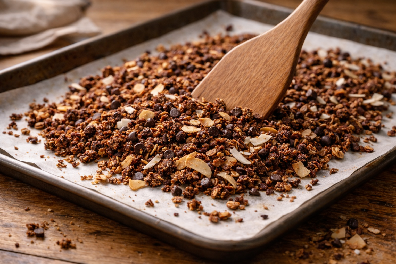 Pour maximiser l’effet chocolat sans augmenter les coûts, joue sur la cuisson, pas sur la quantité de cacao. Une température plus basse et un temps plus long permettent au cacao de griller doucement, développant une saveur plus ronde et plus intense. Résultat : ton granola goûte plus riche avec les mêmes ingrédients. Presse bien à chaud, laisse refroidir sans toucher, et tu obtiens des chunks denses qui rassasient davantage. Moins de portions mangées, plus de plaisir, même budget.