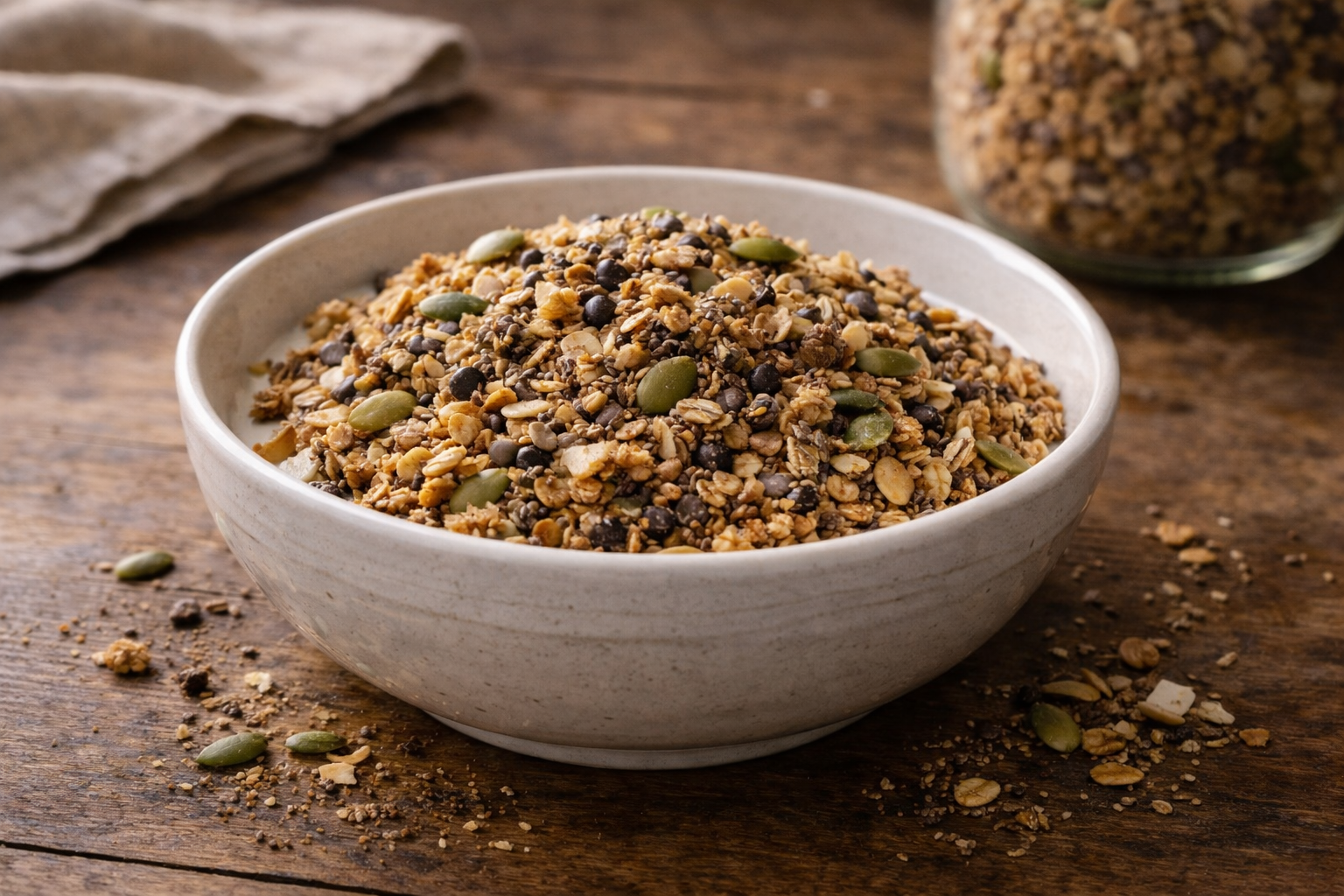 Les graines de citrouille et de tournesol apportent une mâche rassasiante, pendant que le chia agit en silence, prolongeant la satiété sans se faire remarquer. Le sirop d’érable, utilisé avec précision, parfume sans dominer. Résultat : un granola équilibré, réconfortant, qui te suit jusqu’au dîner sans te laisser affamé à dix heures. C’est le genre de déjeuner qui travaille pour toi, pas contre ton portefeuille.