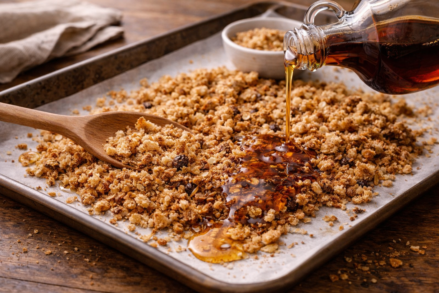 Pour un goût de pain doré encore plus marqué sans ajouter d’ingrédients, sèche légèrement la chapelure avant de l’utiliser : 5 minutes au four pendant le préchauffage suffisent. Elle absorbera mieux le sirop d’érable et développera une saveur toastée plus profonde. Résultat : un granola plus parfumé, plus rassasiant, qui donne l’impression d’un dessert matinal. Moins de portions mangées, zéro gaspillage, et un maximum de satisfaction pour ton budget.