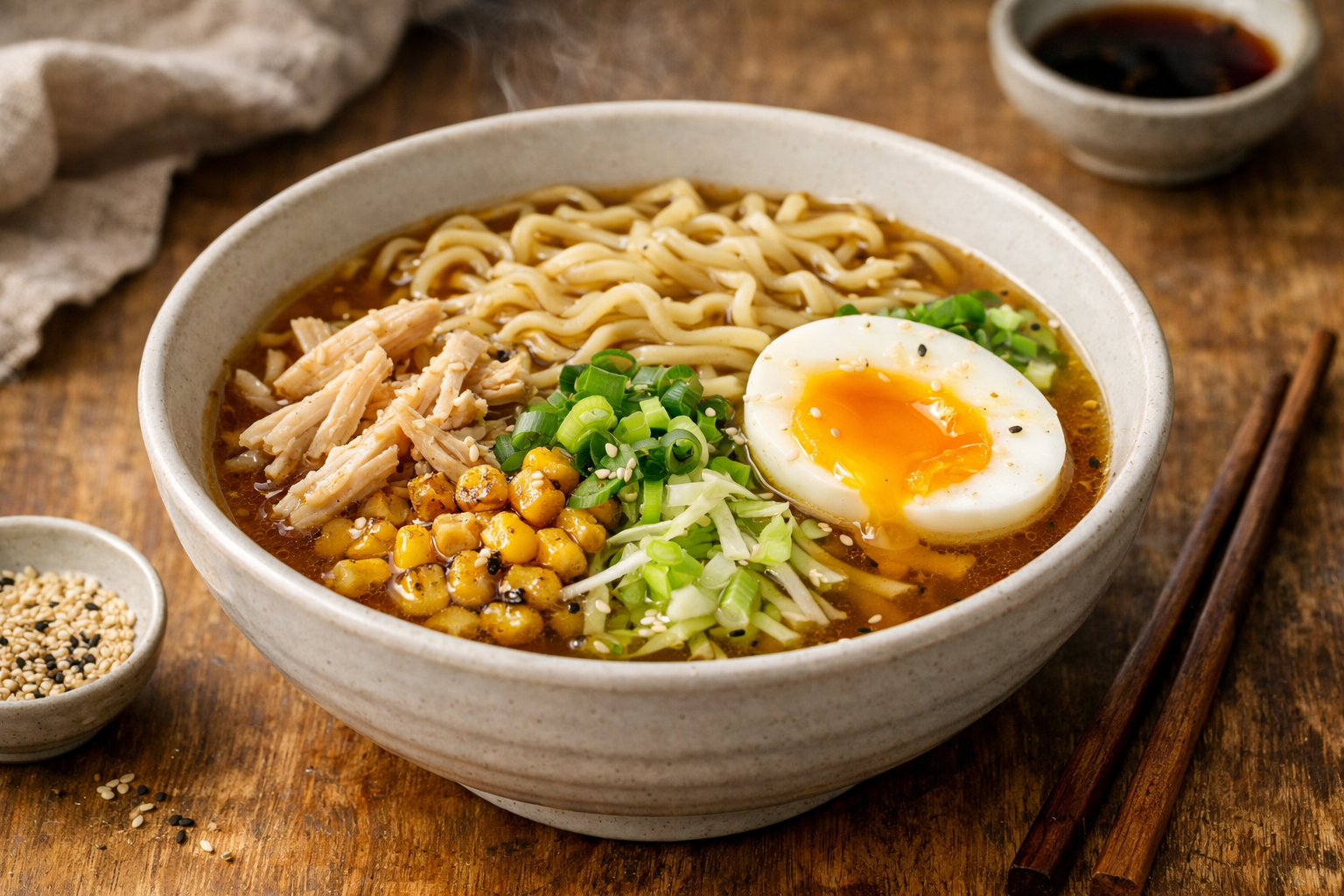 Ce ramen fonctionne parce quâil respecte lâessentiel : un bouillon ambrĂ© bien assaisonnĂ©, des nouilles bien cuites, une protĂ©ine accessible et quelques lĂ©gumes qui apportent texture et fraĂźcheur. LâĆuf mollet joue le rĂŽle du luxe abordable, le chou Ă©tire le volume sans Ă©tirer le budget, et la touche dâĂ©rable Ă©quilibre le salĂ© sans trahir lâesprit japonais. Tout est rĂ©flĂ©chi pour ĂȘtre rapide, reproductible et satisfaisant.