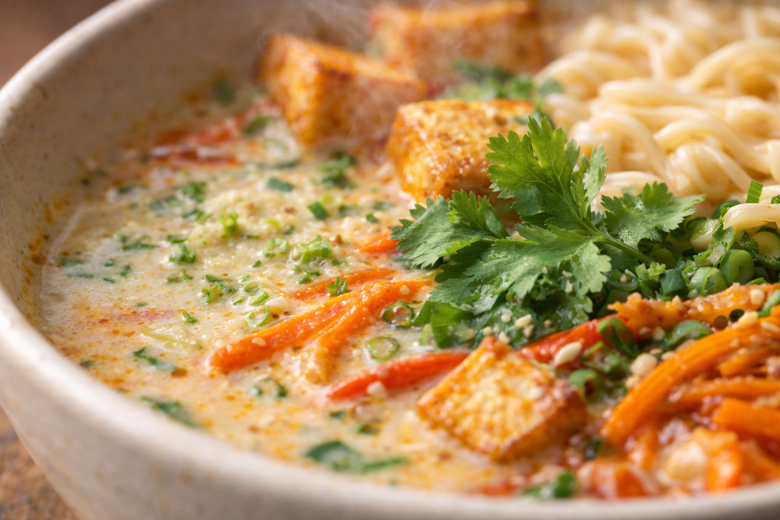 La base au lait de coco apporte le gras rĂ©confortant, la pĂąte de curry ou le cari rĂ©veille les papilles sans brĂ»ler, et la lime vient Ă©quilibrer le tout avec une fraĂźcheur nette. Les lĂ©gumes ajoutent couleur et croquant, pendant que le tofu dorĂ© transforme le bol en repas complet, nourrissant et Ă©conomique. Rien nâest superflu, chaque ingrĂ©dient joue un rĂŽle prĂ©cis.