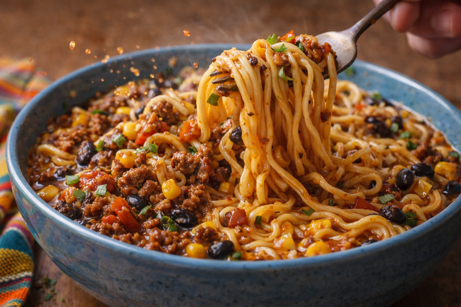 Le bĆuf hachĂ© apporte la richesse et la satiĂ©tĂ©, les Ă©pices taco rĂ©chauffent sans Ă©craser, et la salsa joue Ă la fois le rĂŽle de sauce, dâaciditĂ© et de liant. Le maĂŻs et les haricots noirs ajoutent de la texture, de la couleur et Ă©tirent le volume du plat Ă petit prix. Les nouilles, elles, absorbent tout et transforment ce mĂ©lange en vrai repas complet.