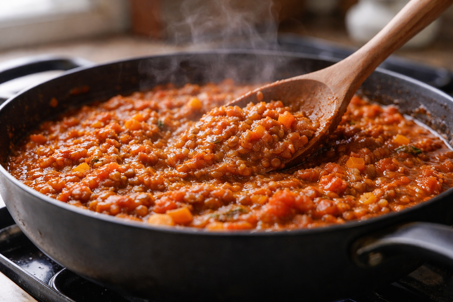 Remplace systématiquement la viande hachée par des lentilles rouges dans les sauces mijotées. Leur amidon naturel crée une texture dense et riche qui imite parfaitement la bolognaise classique, tout en doublant le rendement pour une fraction du prix. Une seule base permet ensuite plusieurs déclinaisons (pâtes, riz, bols, tartines), ce qui fait chuter le coût par repas à chaque réutilisation. C’est une stratégie anti-inflation majeure, validée autant par la cuisine que par l’économie domestique.
