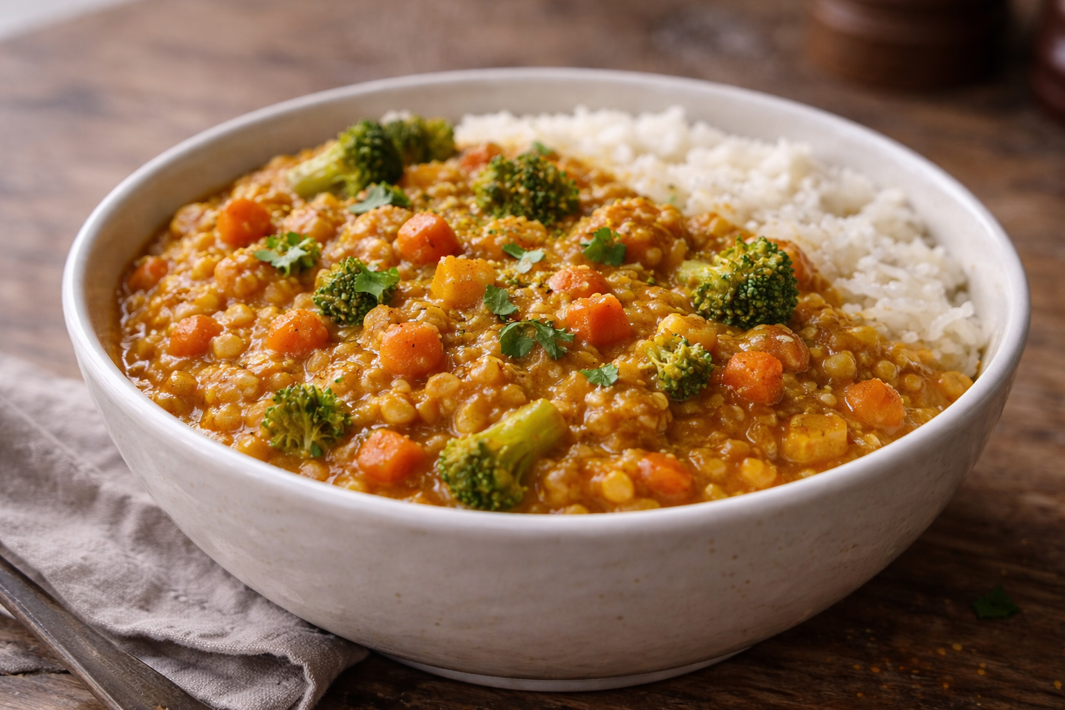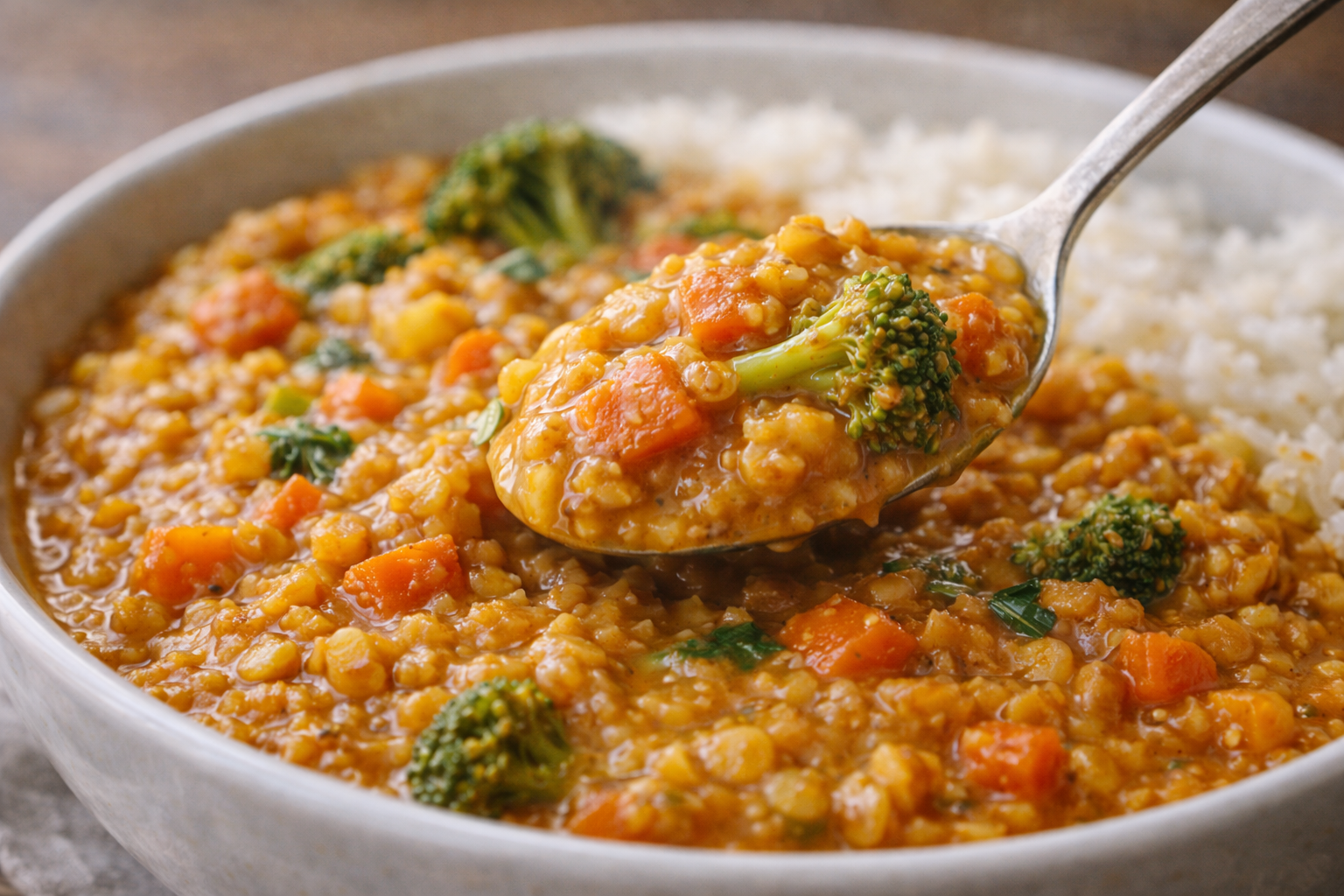 Comme quoi, avec presque rien, on peut créer un bol de vrai réconfort. Un bon cari de lentilles, c’est bien plus qu’un repas économique : c’est un câlin chaud dans un bol, parfait pour les soirs pressés où le budget te rappelle gentiment d’être raisonnable. Ici, pas de lait de coco hors de prix ni d’épices introuvables. Les lentilles rouges, quelques légumes surgelés et deux ou trois aromates de base font tout le travail. Résultat : un plat nourrissant, riche en protéines végétales, prêt en moins de 25 minutes, qui rassasie comme un plat longuement mijoté. Et le bonus FRUGALO ? Il est encore meilleur le lendemain. Le genre de comfort food simple, saine et pas chère qui traverse l’inflation sans broncher.