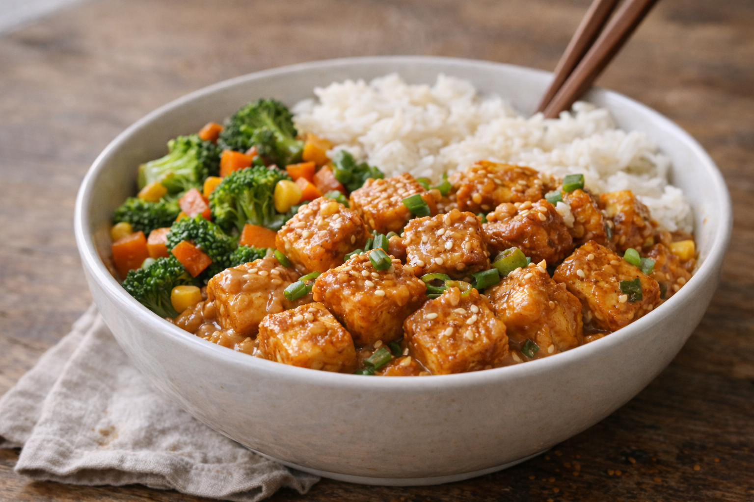 Traite le tofu comme une protéine de rendement, pas comme un substitut fade. Bien pressé, bien doré et nappé de sauce, un seul bloc peut produire plusieurs repas complets et remplacer efficacement un take-out asiatique à 15–20 $. Combiné à du riz jasmin — peu coûteux, ultra rassasiant et excellent absorbeur de sauces — le volume augmente, la satiété aussi, et le besoin en protéines chères diminue. Résultat : assiette pleine, envie comblée, budget maîtrisé.