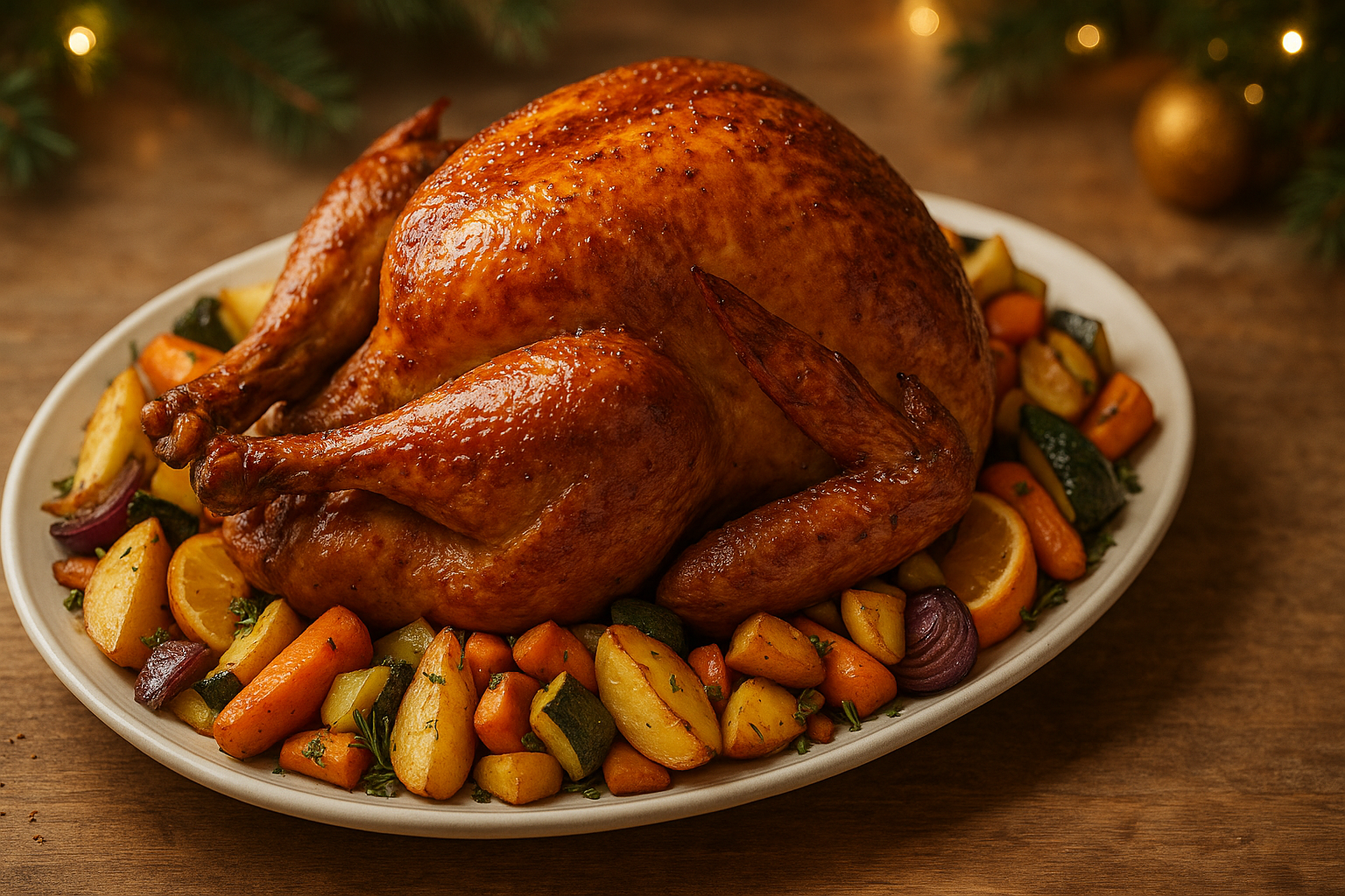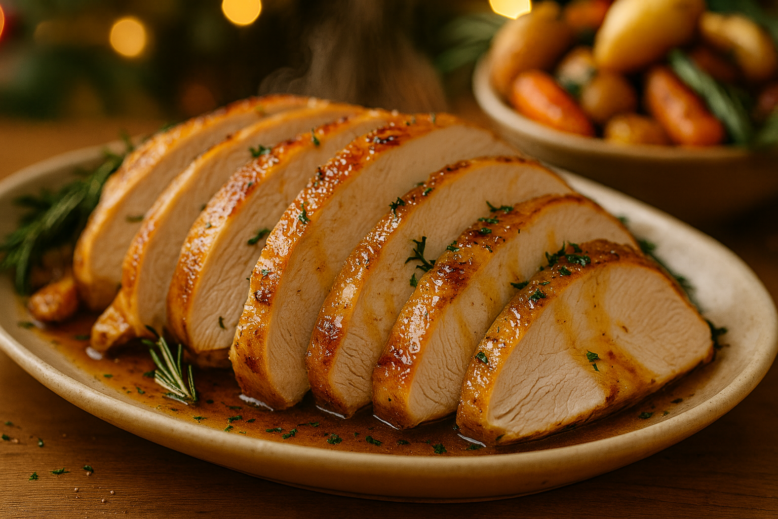 Une fois la dinde retirée : Verser 60 ml (4 c. à soupe) d’eau chaude dans la rôtissoire. Racler les sucs caramélisés. Fouetter 20 à 30 secondes avec le jus des légumes. Tu obtiens un jus corsé, brillant, riche, exactement comme ceux facturés par les traiteurs — mais gratuitement. Pour un parfum festif inoubliable, ajouter 1 c. à soupe de zeste d’orange frais dans le jus au moment de servir.