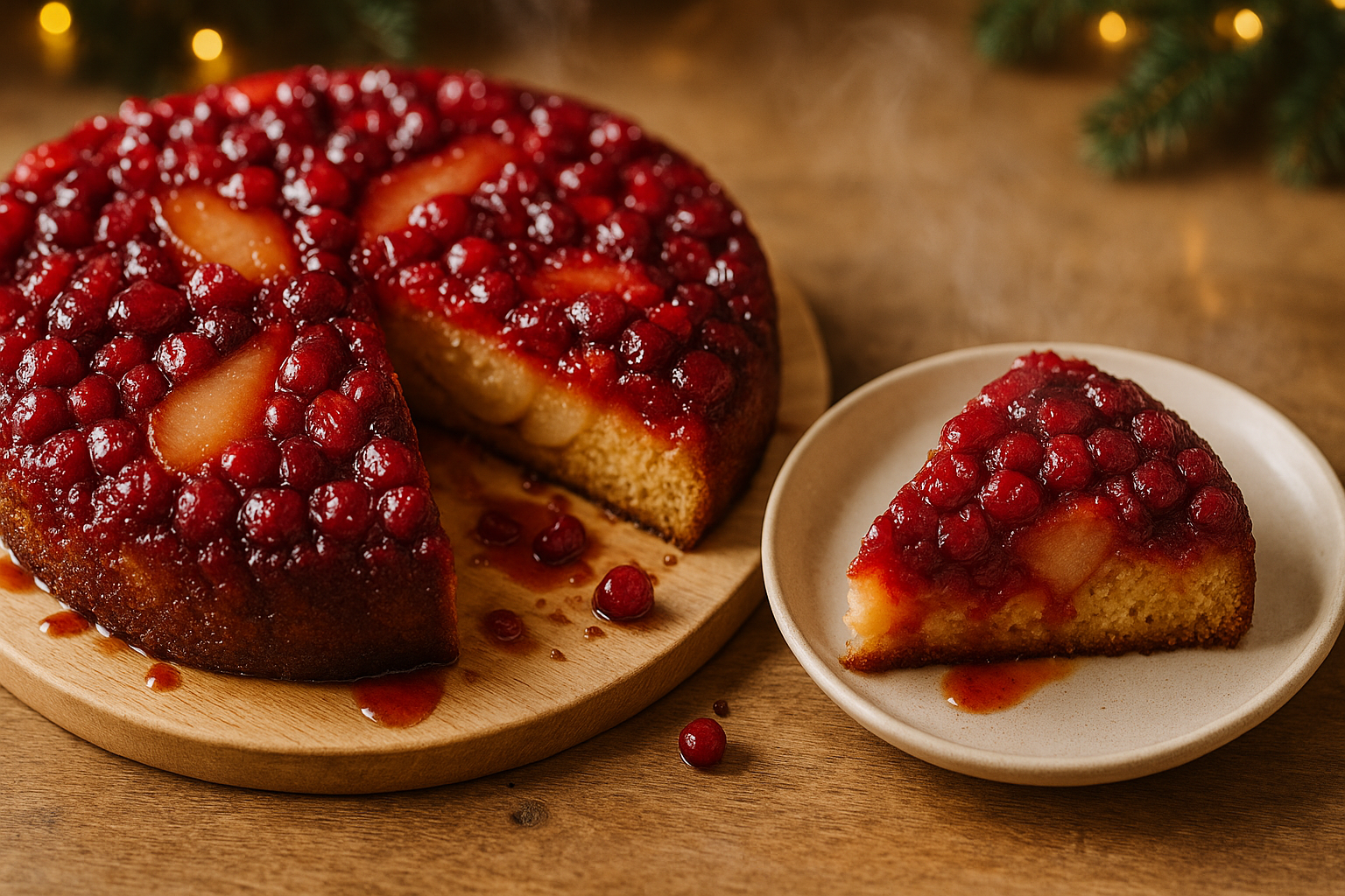 Ce gâteau renversé poires–canneberges est le dessert frugal chic idéal : simple à préparer, impossible à rater et tellement spectaculaire lorsqu’il arrive au centre de la table. Les poires deviennent caramélisées, les canneberges éclatent en rubis brillants, et la pâte moelleuse absorbe tous les jus pour un résultat fondant, parfumé et chaleureux. C’est le type de dessert que les familles québécoises adorent : généreux, réconfortant, servi chaud, et préparé avec des ingrédients abordables. Et pourtant, son visuel est digne d’un magazine. C’est le dessert parfait pour conclure un réveillon à douze — festif, simple, économique et mémorable.