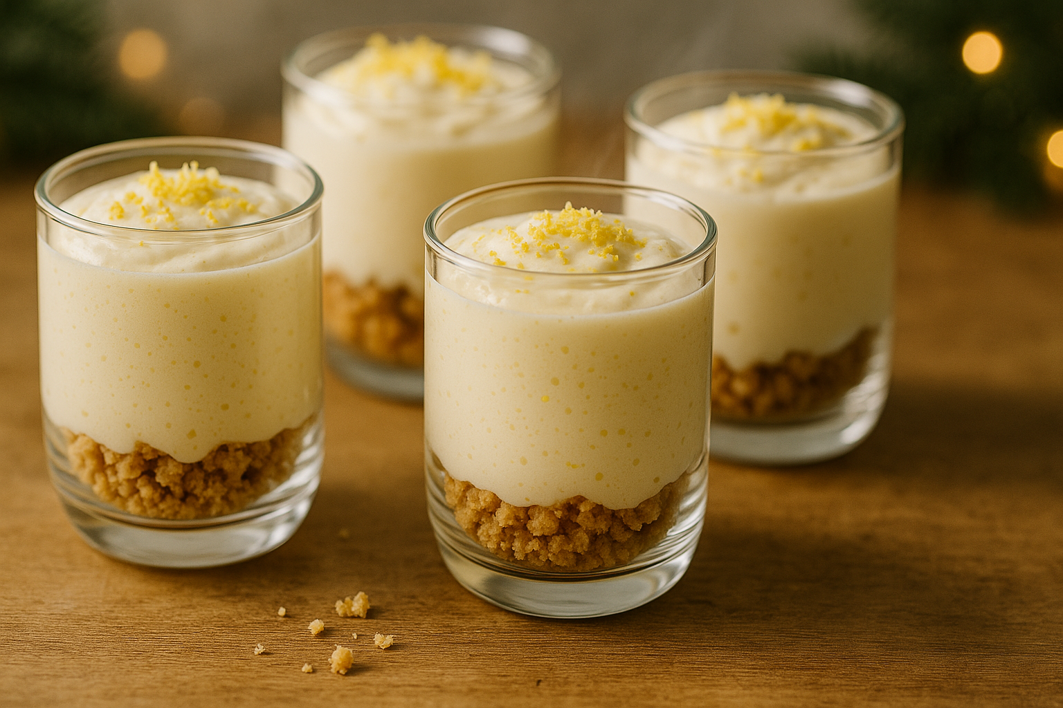 Juste avant de servir, ajoute un voile de zeste de citron micro-râpé sur chaque verrine, suivi d’un filet ultra fin de miel (optionnel mais magique). Le zeste crée un effet neige brillante, et le miel capte la lumière comme un vernis — un fini digne d’un chef pâtissier, pour quelques cents par portion.
