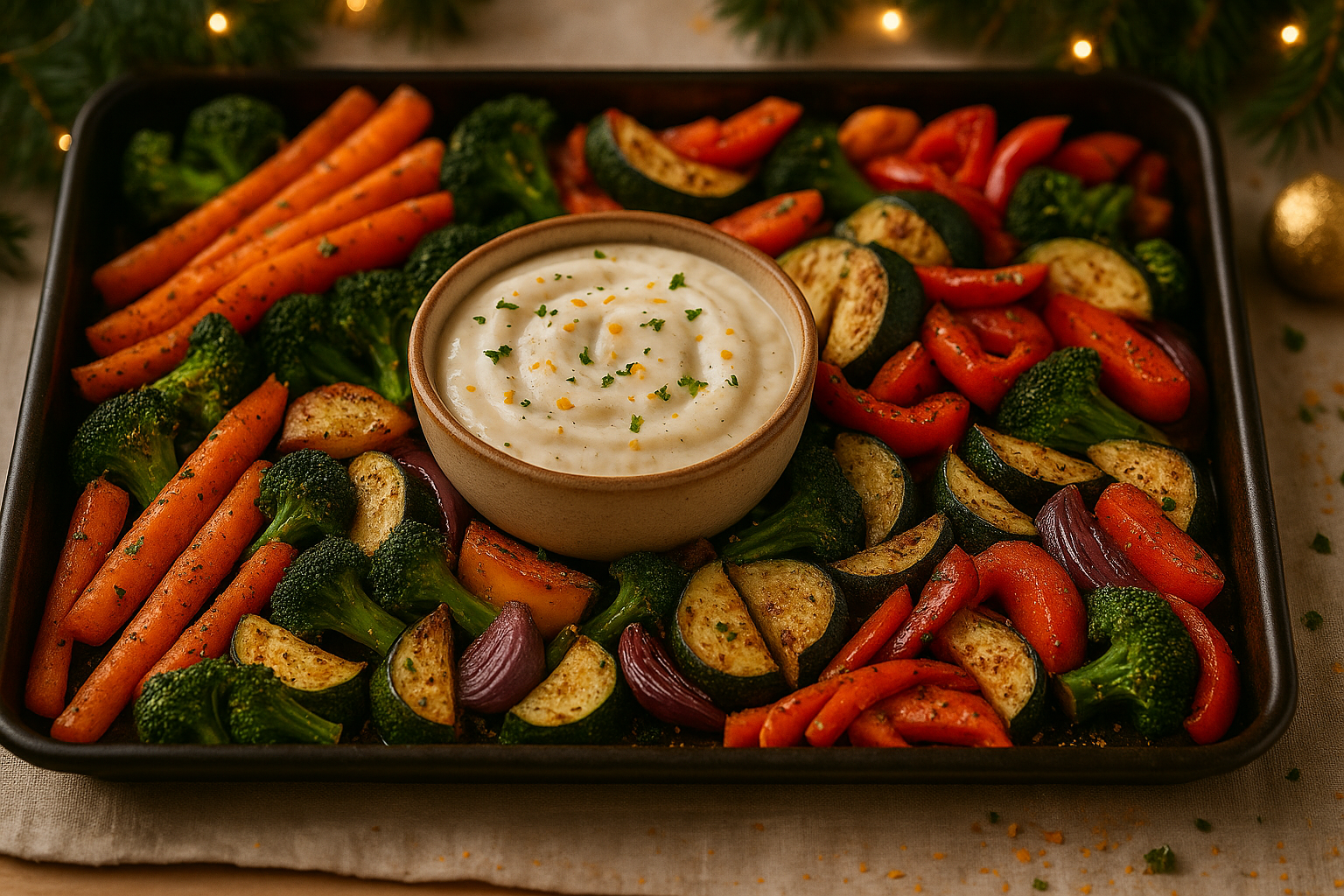 Ce plateau de légumes rôtis est l’une des entrées les plus spectaculaires et économiques que tu puisses servir au réveillon. Les couleurs flamboyantes, les textures caramélisées et l’arôme irrésistible des légumes chauds créent immédiatement une ambiance de fête digne d’un buffet haut de gamme. En plus d’être visuellement magnifique, cette entrée stabilise l’appétit, apporte de la fraîcheur et prépare parfaitement le terrain pour les plats principaux. Accompagnée d’une trempette citron-ail veloutée, elle devient un duo gagnant : chic, santé, frugal et absolument impossible à rater. Une entrée qui fait parler… et qui coûte presque rien.