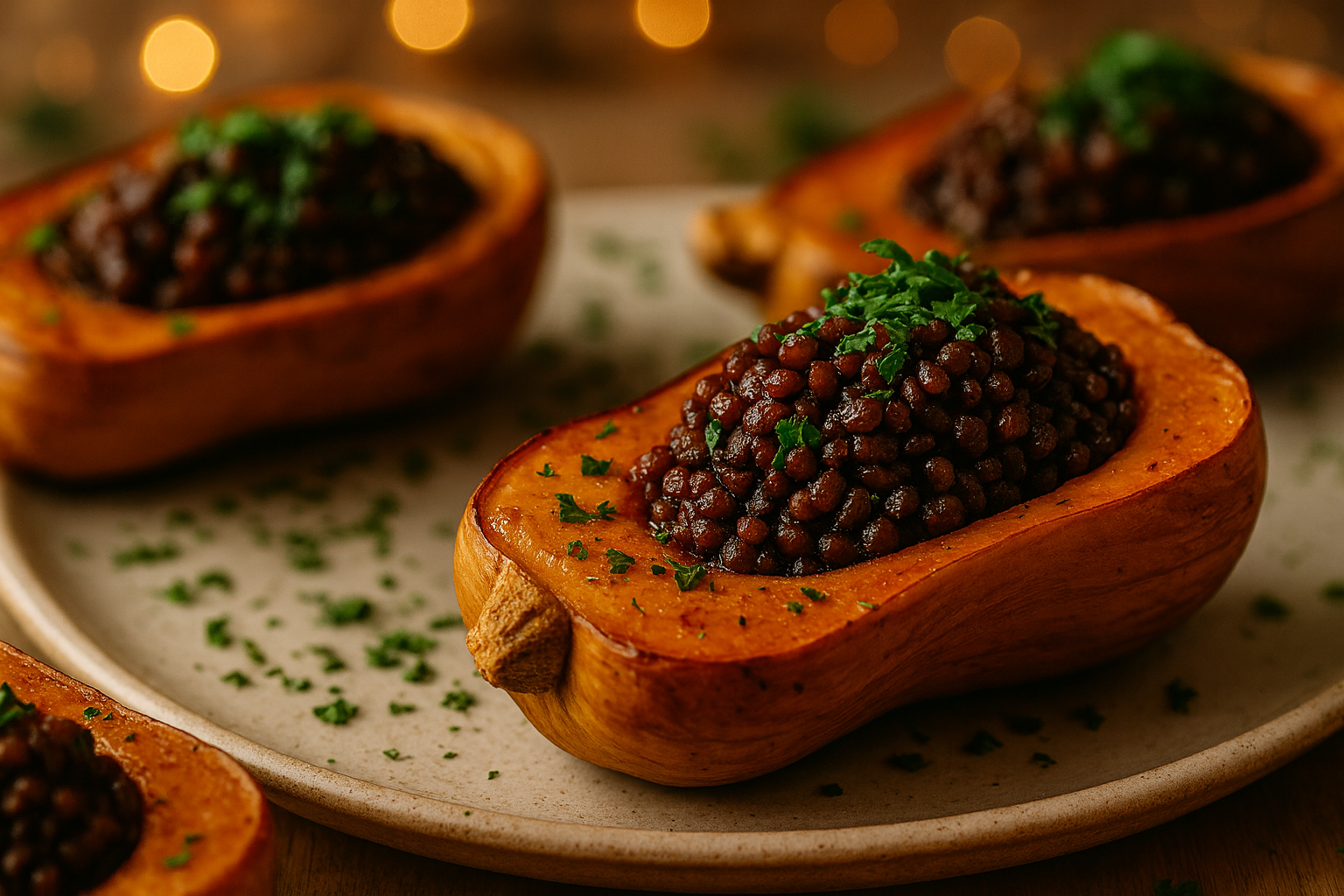 4. Montage final (effet gastronomique garanti). Renverser chaque demi-courge cuite.À l’aide d’une cuillère, écraser légèrement le centre pour créer un petit “nid”. Remplir généreusement avec la farce chaude aux lentilles balsamiques. Enfourner 10 minutes pour fusionner les saveurs. Garnir d’herbes fraîches ou micro-pousses juste avant le service.