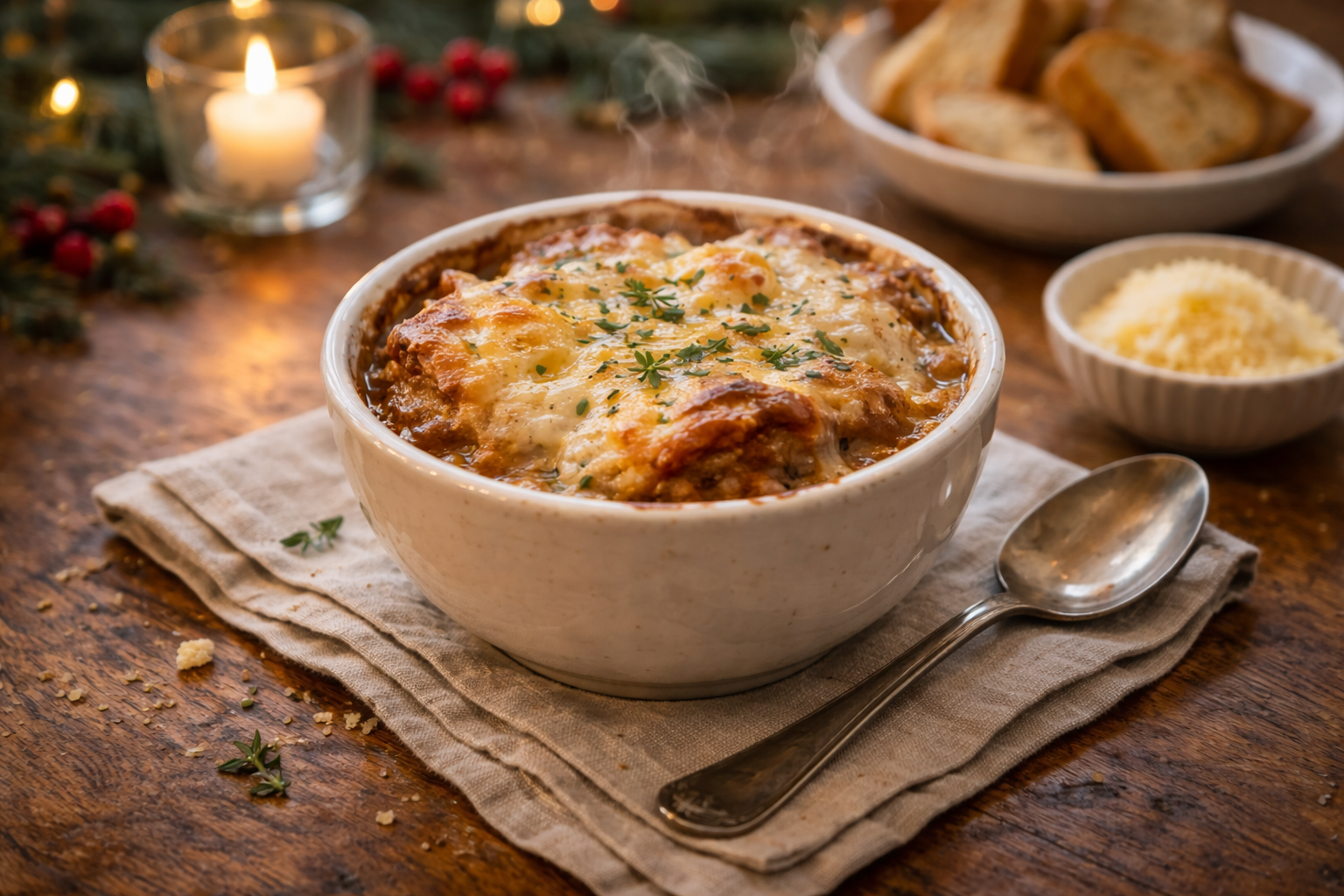 La soupe à l’oignon est l’une de ces entrées intemporelles qui n’ont jamais besoin de justification. Elle arrive chaude, profonde, enveloppante, et transforme immédiatement l’atmosphère autour de la table. C’est une recette humble, bâtie sur des ingrédients simples, mais dont l’impact émotionnel est immense quand elle est bien exécutée. En format réception, servie en petites portions, elle joue un rôle stratégique : elle rassure, elle réchauffe et elle installe un rythme calme et convivial dès le début du repas. Elle ouvre l’appétit sans alourdir, tout en donnant une impression de cuisine maîtrisée et généreuse. Son parfum évoque les brasseries d’hiver, les longues conversations et les réveillons sans précipitation. Frugale par nature, spectaculaire par son effet, la soupe à l’oignon est l’exemple parfait qu’un plat économique peut devenir profondément festif lorsqu’on lui laisse le temps de développer toute sa richesse.