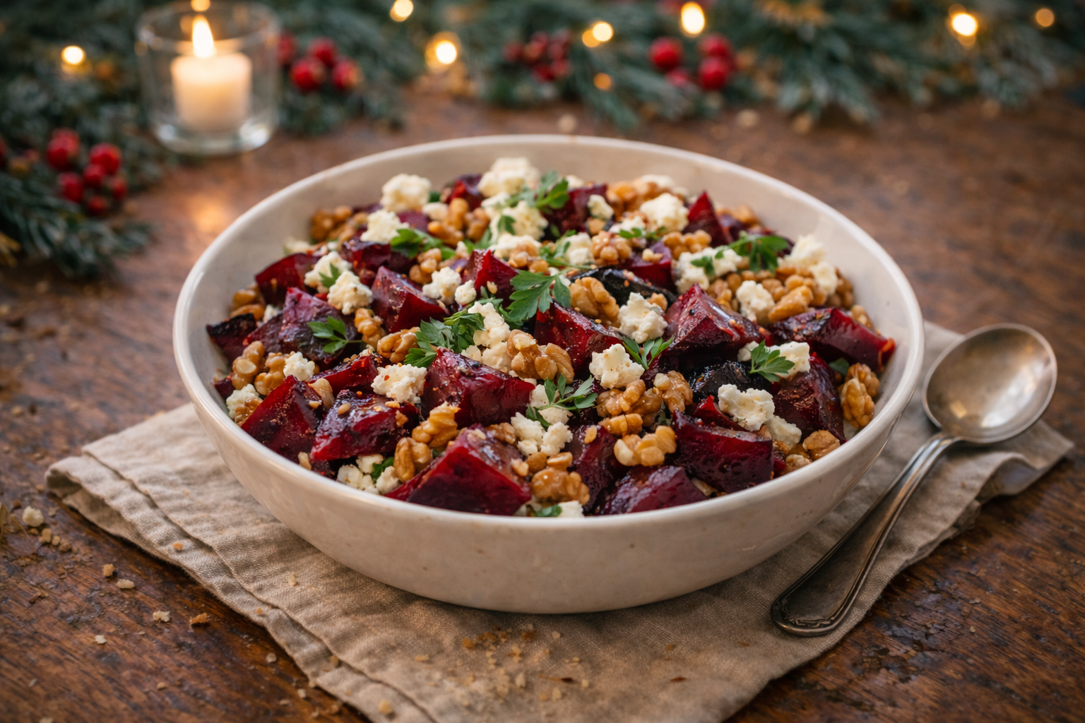 Cette salade tiède est exactement le genre d’entrée qui fait respirer un réveillon bien pensé. Elle apporte de la couleur, de la douceur et un contraste réconfortant qui équilibre parfaitement les plats plus riches à venir. Les betteraves, légèrement sucrées et servies chaudes, évoquent immédiatement la cuisine d’hiver : simple, nourrissante, rassurante. Le fromage crémeux ajoute la rondeur, tandis que les noix apportent ce croquant essentiel qui donne du relief à chaque bouchée. C’est une entrée qui ne cherche pas à impressionner par la complexité, mais par l’harmonie. Elle se prépare rapidement, se dresse facilement sur un grand plat et donne une impression de générosité maîtrisée. En format réception, elle joue un rôle stratégique : elle stabilise l’appétit, apaise le rythme du repas et installe une ambiance chaleureuse, élégante et profondément conviviale. Du frugal chic pur, pensé pour recevoir intelligemment.