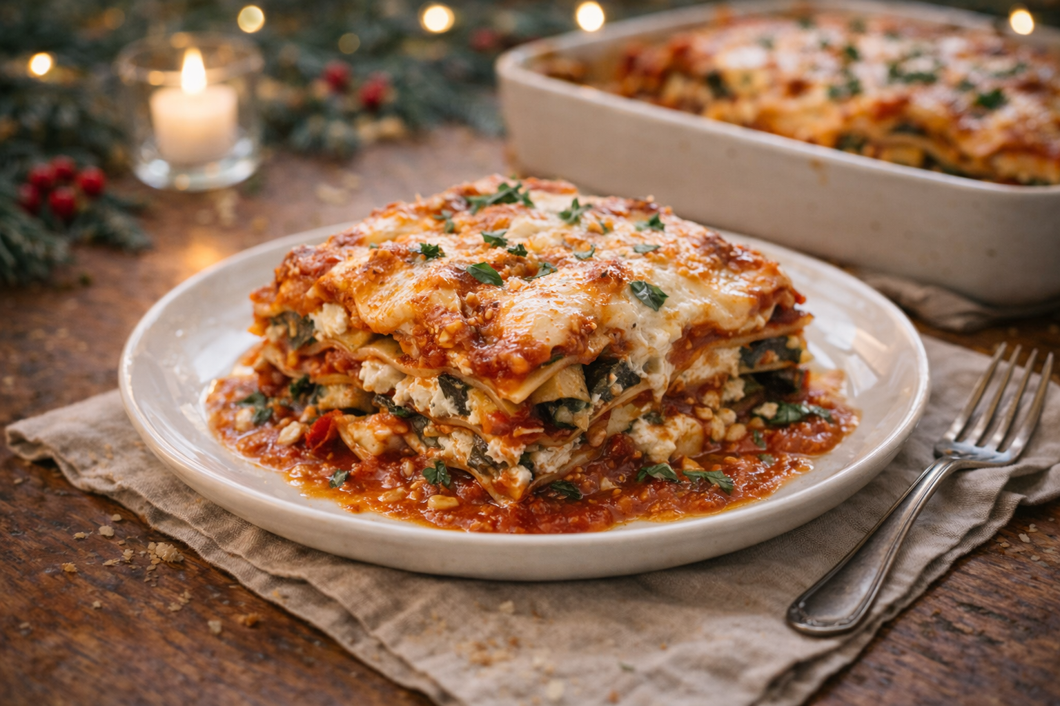 Il y a peu de plats capables de mettre tout le monde d’accord autour d’une table des Fêtes. La lasagne végé en fait partie. Riche sans être lourde, colorée sans être tape-à-l’œil, elle rassure autant qu’elle impressionne. Ce plat est une démonstration parfaite de frugalité intelligente : des légumes simples, rôtis pour développer leur saveur, une ricotta douce pour la rondeur, et une sauce tomate généreuse qui lie le tout. Même les invités les plus attachés à la viande se surprennent à en reprendre, non par obligation, mais par plaisir. En format réception, la lasagne joue un rôle clé : elle nourrit vraiment, se prépare à l’avance et se réchauffe parfaitement, ce qui libère du temps et de l’énergie le jour du réveillon. C’est un plat qui rassemble, qui calme le rythme du repas et qui donne une impression de table abondante, cohérente et chaleureuse. Du frugal chic dans toute sa logique.
