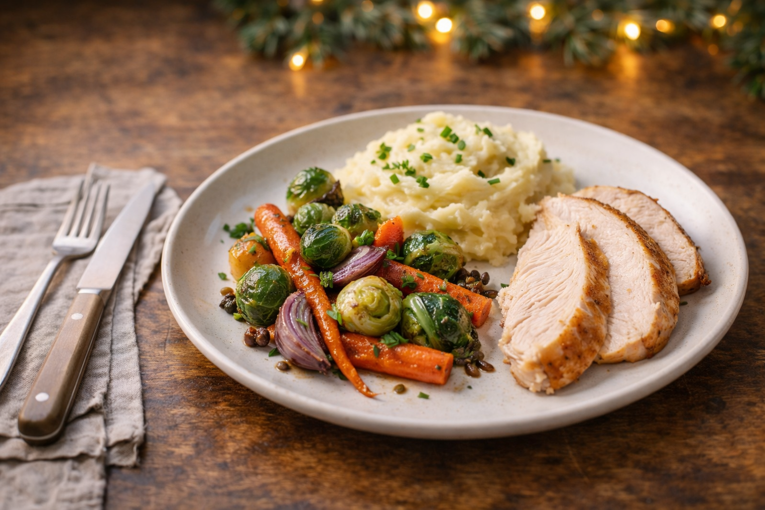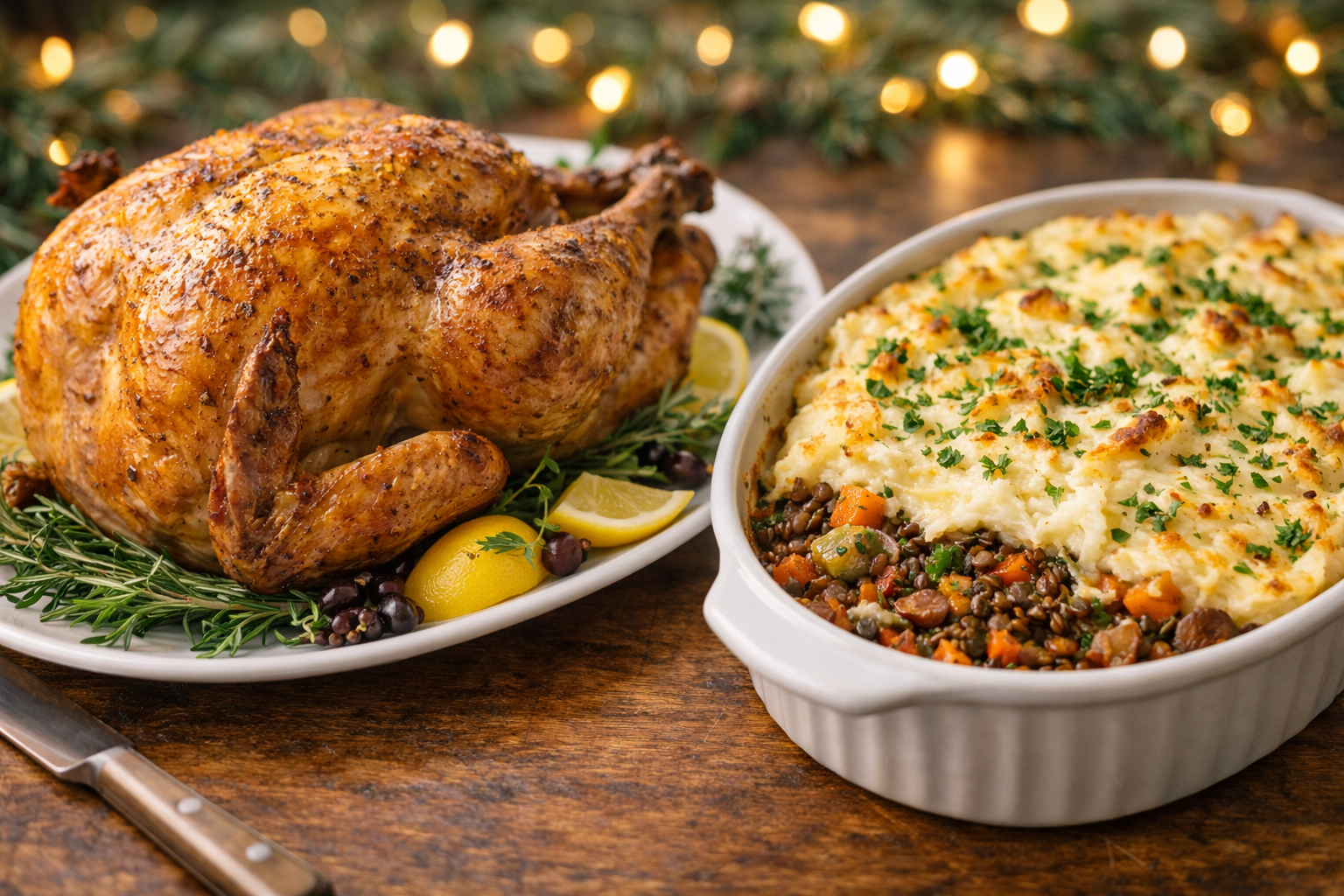 Le premier, c’est presque toujours une volaille : dinde, poulet rôti, pintade. C’est le symbole classique, l’élément visuel qui incarne Noël. Le deuxième plat, lui, est ta carte maîtresse frugale : un plat végétarien riche, parfumé, généreux. Ça peut être un gratin de courges, un parmentier de lentilles, un ragoût végétal. Pourquoi un plat végé? Parce qu’il coûte cinq fois moins cher qu’un plat de viande, qu’il apporte de la couleur et qu’il donne une impression d’abondance. C’est la base même de la frugalité chic : donner le luxe… sans la facture.