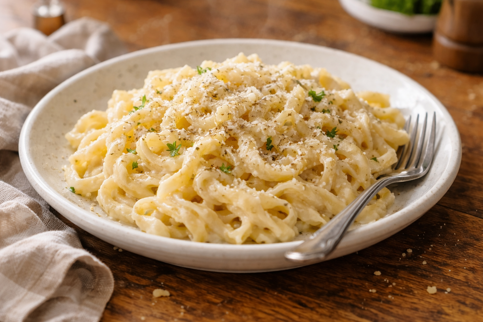 1. Pâtes crémeuses ail & parmesan — le classique qui rassure sans voler le show