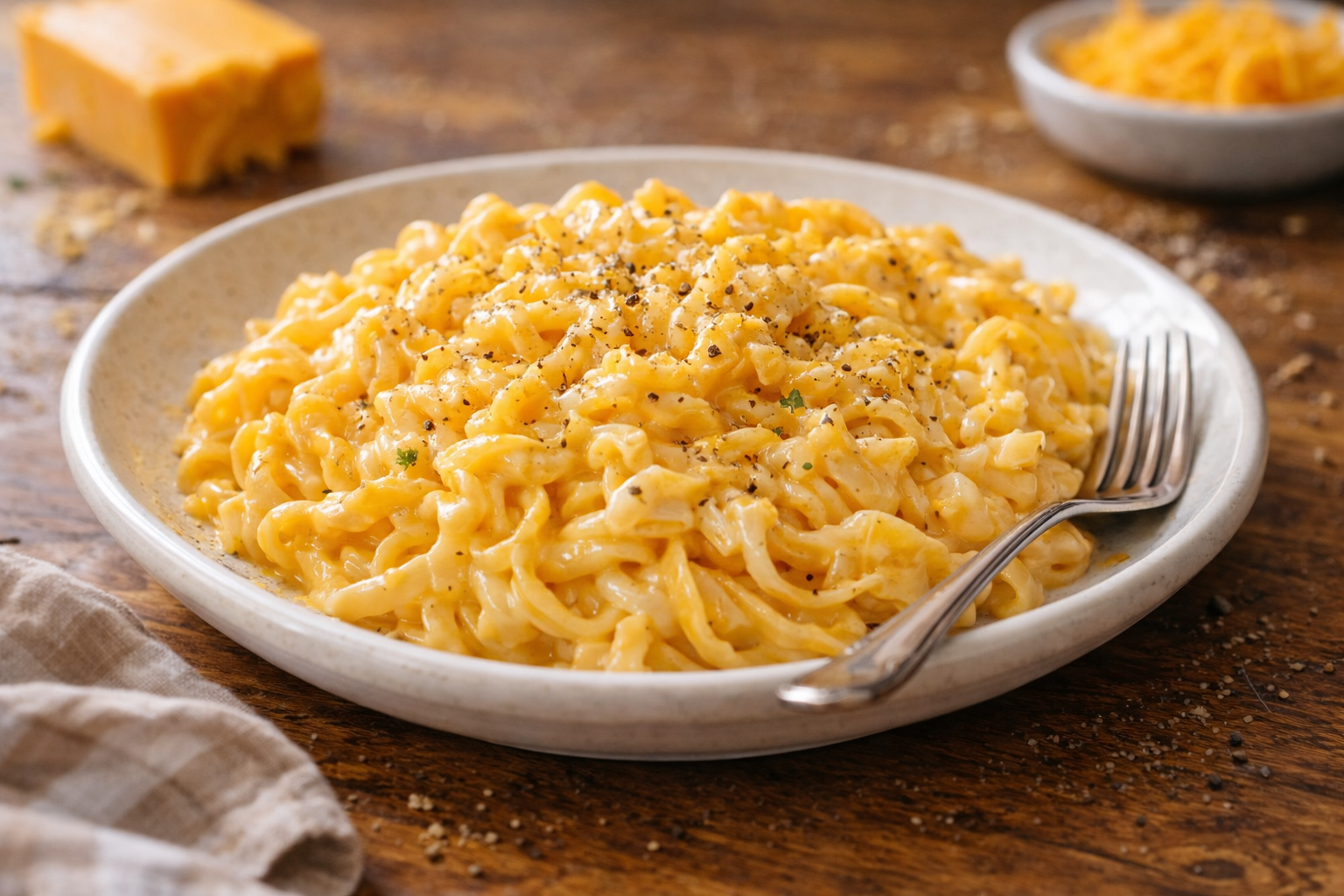 4. Pâtes crémeuses au cheddar doux — le confort maîtrisé
