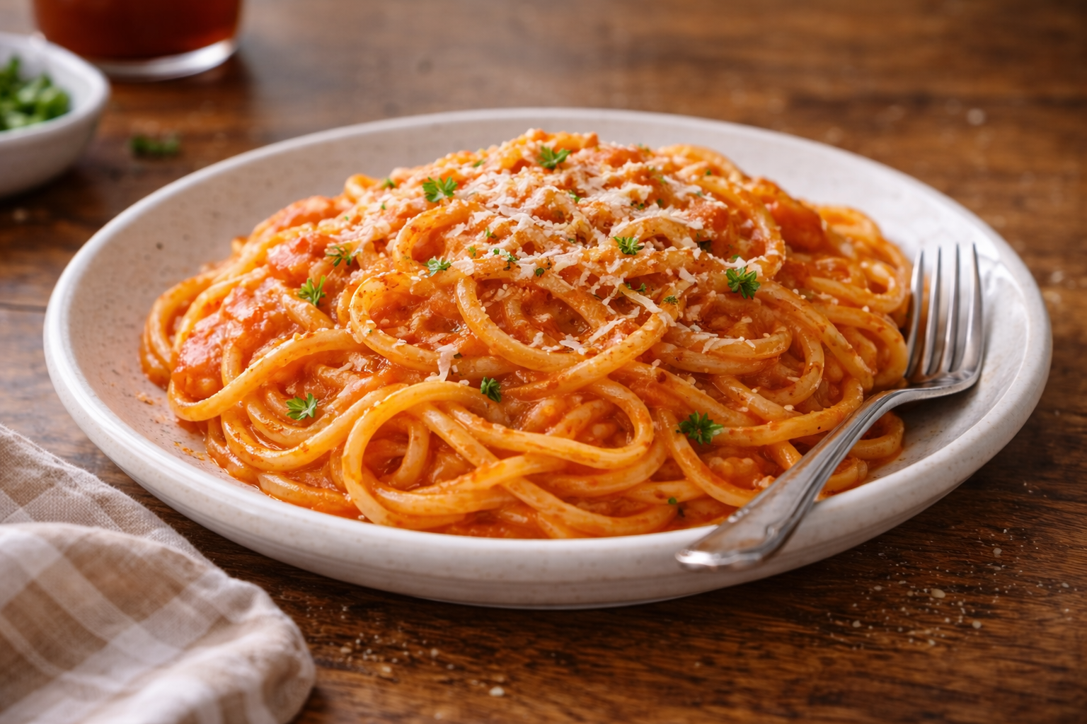 Une sauce douce enlace les pâtes, le stress tombe, la table respire