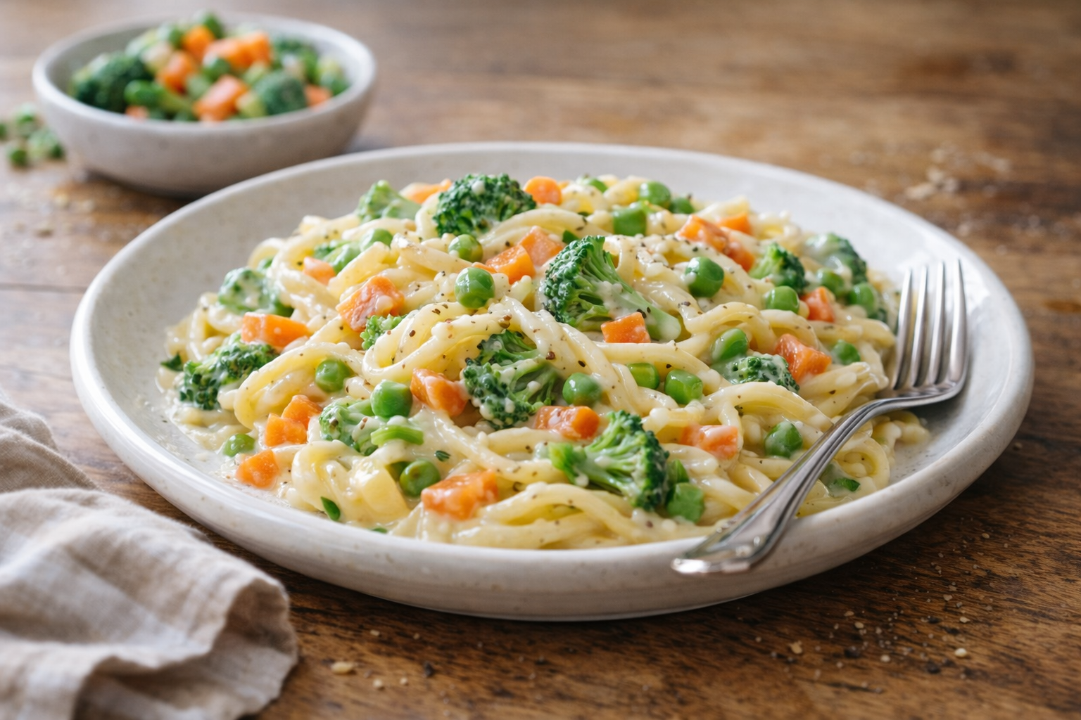 8. Pâtes crémeuses aux légumes surgelés — quand le congélateur sauve le repas