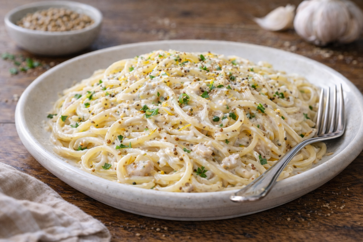 10. Pâtes crème, ail & moutarde jaune — la sous-estimée absolue